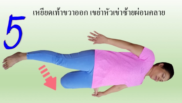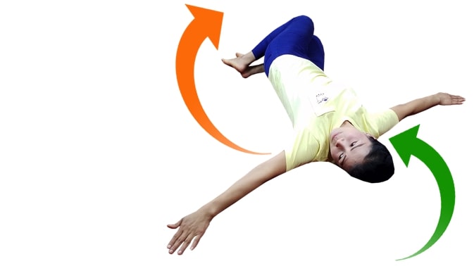 Be in supine position. Relax your body. Without moving the upper body, sway the legs like swaying tail of swimming fish to allow the both side of the muscles along the spine to contract and extend in the balance.